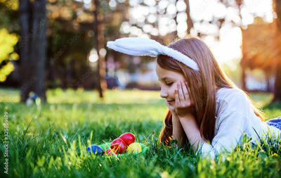 Easter holiday. Cute little girl with a bunny ears and colorful eggs in the meadow