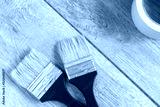 Set of two blue paint brushes and adhesive tape on a gray laminate. Image on the theme of repair, decoration, construction work. Copy space.