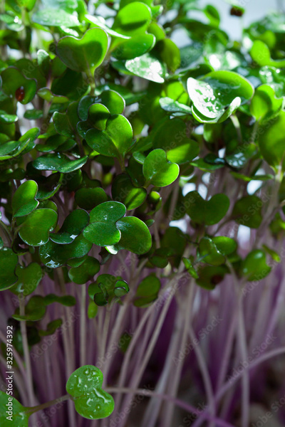 Young sprouts of organic kohlrabi cabbage close up. Micro greens concept