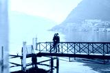 Gorgeous couple standing on a pier and embraces and he looks on her. Love and feelings concept. Beautiful couple embracing near the shore of a mountain lake Lugano, Switzerland.