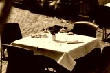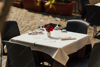 Beautiful decorations of table in open air. Close up view of restaurant table with romantic place setting with red flowers, plates, cutlery on white background. Romantic dinner.