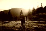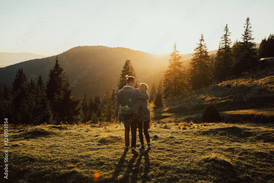 Happy couple hugging and walking at sunset with amazing mountain view. Warm evening sunlight. Travel concept.Beautiful landscape with pine forest.