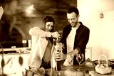 Couple of young millennials in love in the kitchen in the new apartment - Woman opens a bottle of wine with a corkscrew
