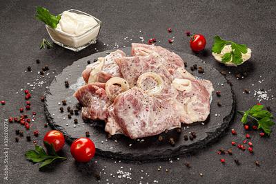 Shooting for the catalog. Raw meat Marinated pork, chicken and veal kebabs. background image, copy space text