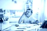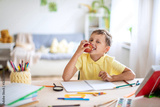 Cheerful boy bites off Apple sitting at Desk, after completing school homework