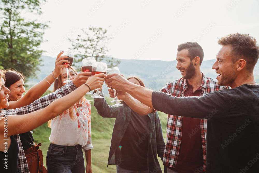 Group of friends making a toast during a barbecue in the countryside - Happy people having fun at a picnic on the hills in summer