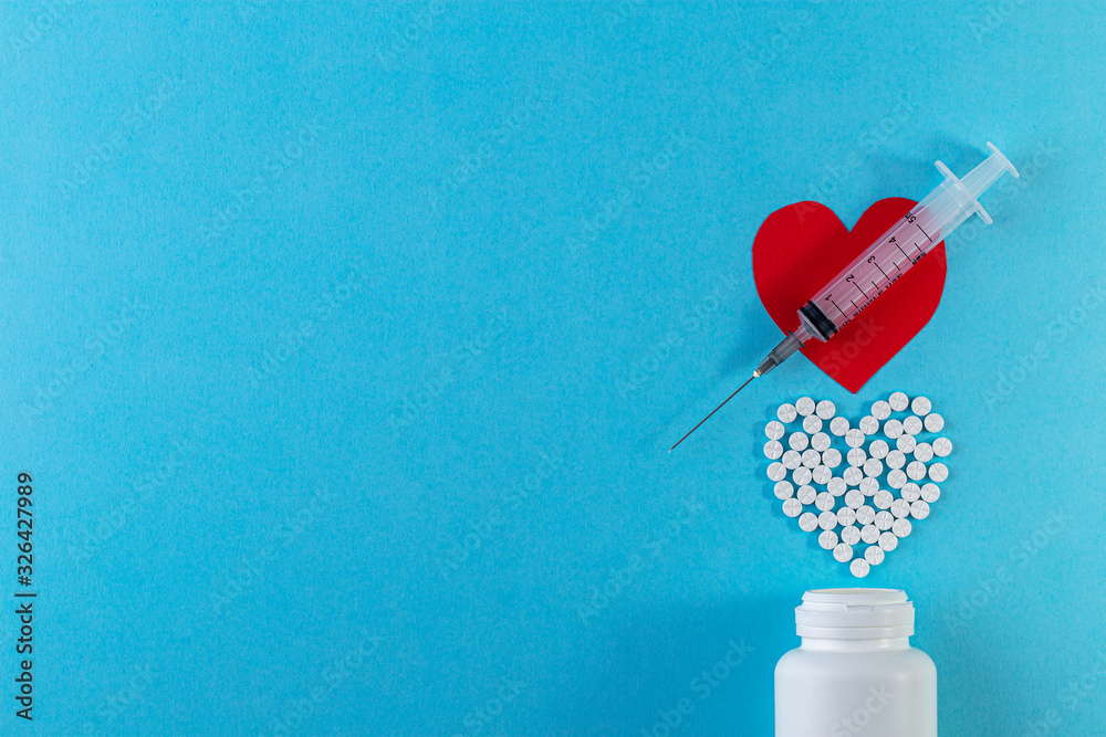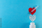 Heart shape made of pills and syringe on blue background. Pharmaceutical medicament, cure in container for health. Medicine concept. Top view, Flat lay with copy space