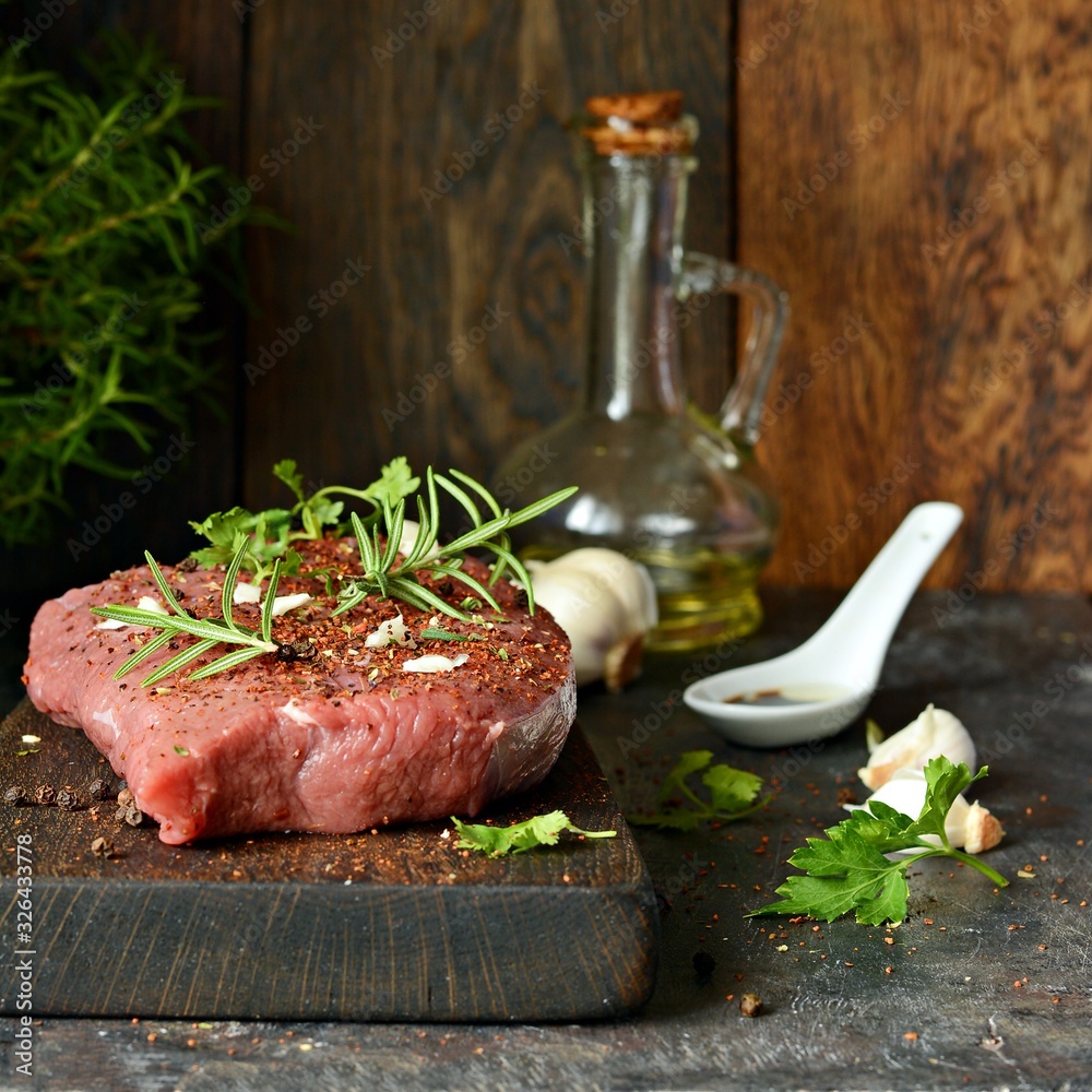 Fresh raw piece of beef steak with herbs and spices on wooden board on a dark background. A good piece of meat for cooking dinner.