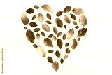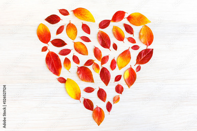 Red-yellow heart from fallen leaves on a light wooden background. A symbol of the autumn wedding, late love, love of the elderly.