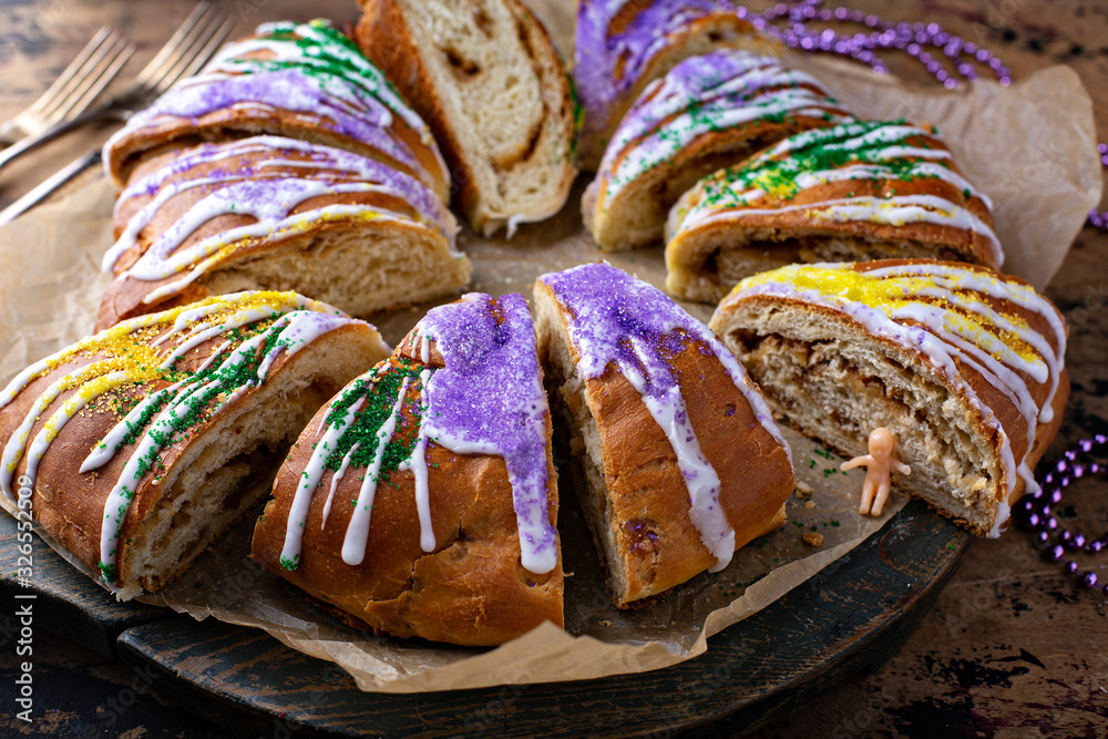 King cake for Mardi Gras, New Orlean traditional pastry with a plastic baby