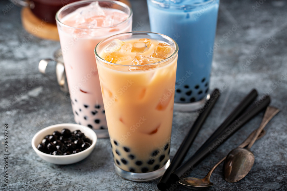 Variety of milk bubble tea in tall glasses, strawberry, butterfly tea and black