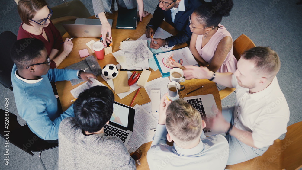 Top view multiethnic creative team brainstorming in trendy modern coworking office. Female boss leads the meeting 4K.