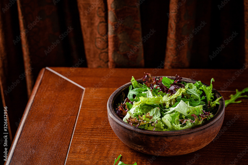 Raw food concept. A plate with fresh salad is on the table. background image, copy space text