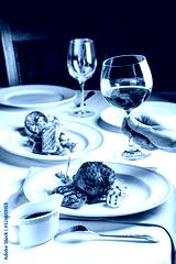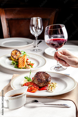 American cuisine. A man in a restaurant eating steak and grilled vegetables, washed down with red wine. background image, copy space text
