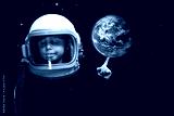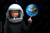 A small child imagines himself to be an astronaut in an astronaut's helmet.