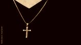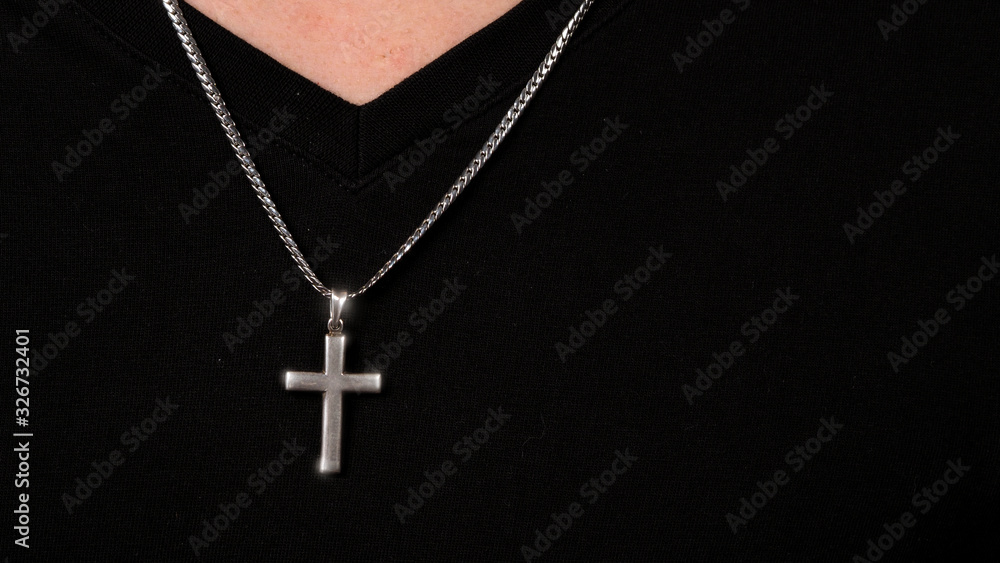Silver crucifix or cross pendant and necklace on body or hand studio shot black color background which represent to praying for god or jesus for christian religion people who have faith