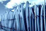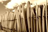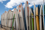 Surfboards waiting for surfers on Waikiki beach in Oahu Hawaii
