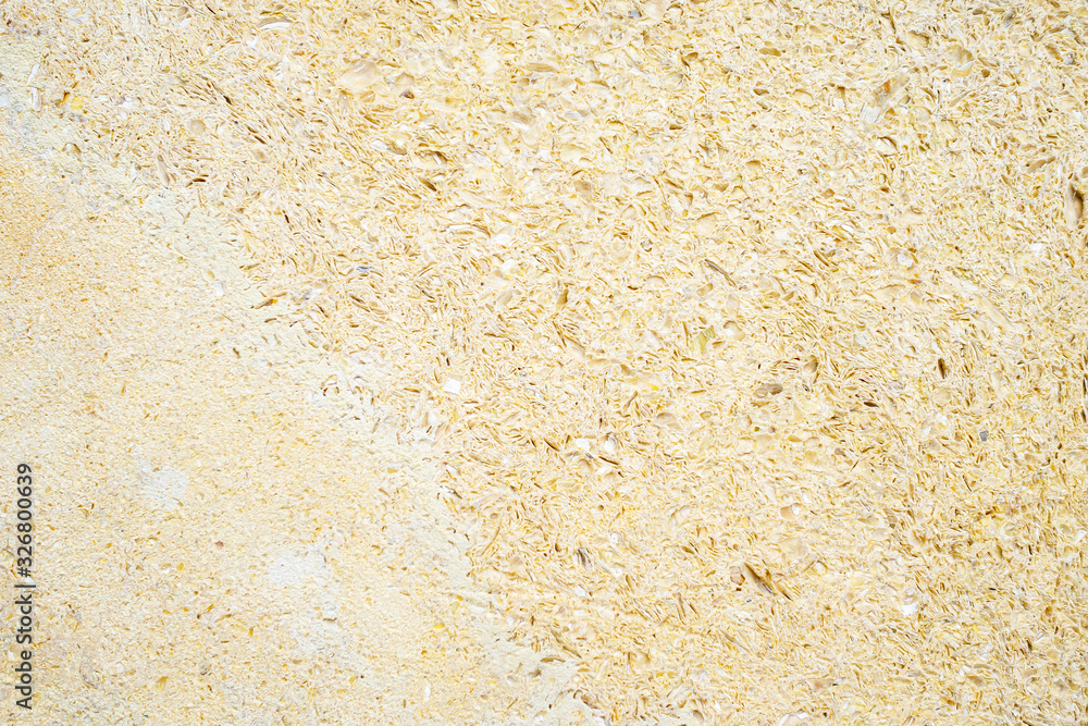 The decorated wall is made of carved pressed shell rock. Large and small inclusions of shells on a light yellow background for design on a building architectural theme