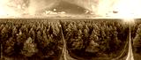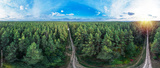 Picturesque and vivid view of evergreen pine forest and blue sky with white clouds.