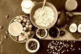 food, eating and breakfast concept - oatmeal cereals in bowl, fruits, almond nuts, glass of juice and jug with milk on slate stone table