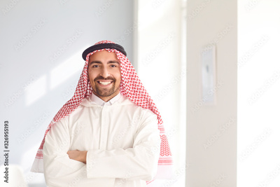 Positive arabic man smiling while standing in a white bright room