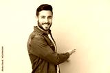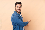 Caucasian handsome man isolated on beige background extending hands to the side for inviting to come