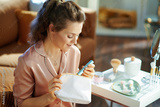 woman holding mascara and looking inside white small bag