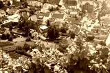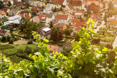 Vineyards growing on a hill above a German village. Colourful travel and wine-making background