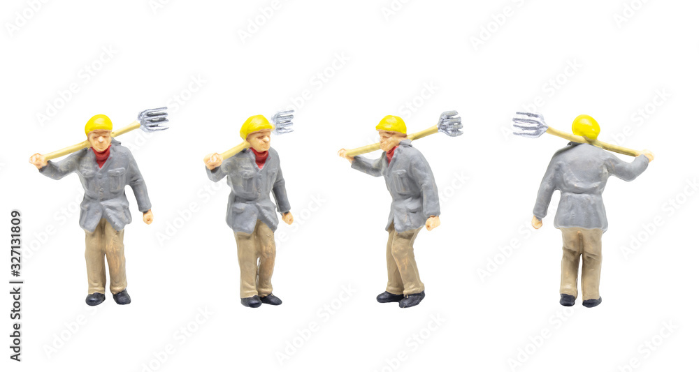 Miniature figurine character as railway track worker posing in posture isolated on white background.