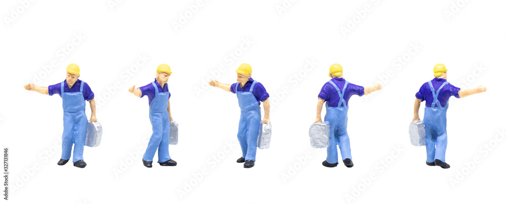 Miniature figurine character as railway track worker posing in posture isolated on white background.