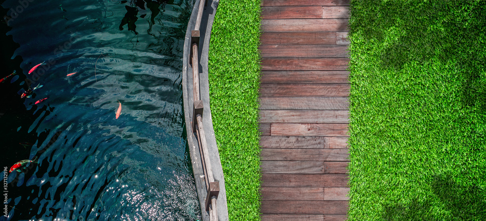 Outdoor Design Concept : Top view of fresh water in pond with green grass meadow field with wooden walkway in outdoor garden.