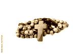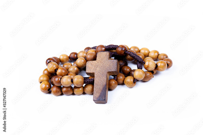 Brown wooden christian rosary curled up, christianity religious symbols isolated on white. Cross symbol in the middle. Chaplet of Divine Mercy prayer conept. Faith, belief. Studio shot