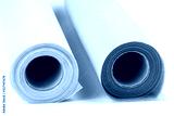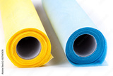 Simple new dental medical patient bibs, two rolls, yellow and blue on white, disposable bib water absorbing material, medical dental clinic safe clean workplace, hygiene supplies, closeup, nobody