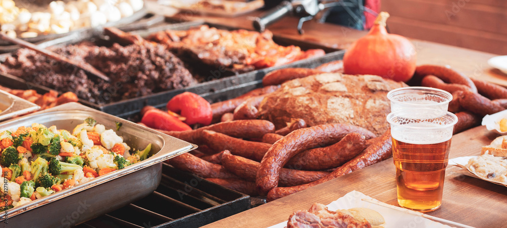All kinds of delicious tasty food and plastic glasses of beer with foam banner background. Bbq, grill, different kinds of food. Grilled vegetables, sausages, bacon, juicy meat. Gastronomy backdrop