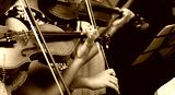 Row, group of anonymous violin players, children, people playing, bows in hands, stands in front, closeup. Classical music concert simple performance kids orchestra string section / quartet performing