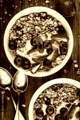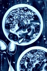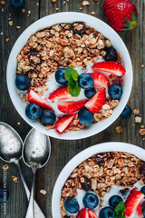 Healthy breakfast granola with fresh strawberry and blueberry.