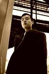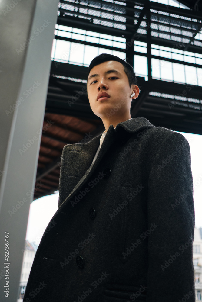 Young Asian businessman in wireless earphones intently looking in camera waiting public transport