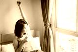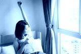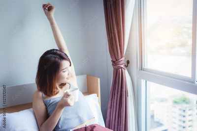 Beautiful young asian woman drinking hot black coffee in morning and stretching body on bed near window at bedroom in morning. Pretty girl look through window for seeing nice view. She wake up early