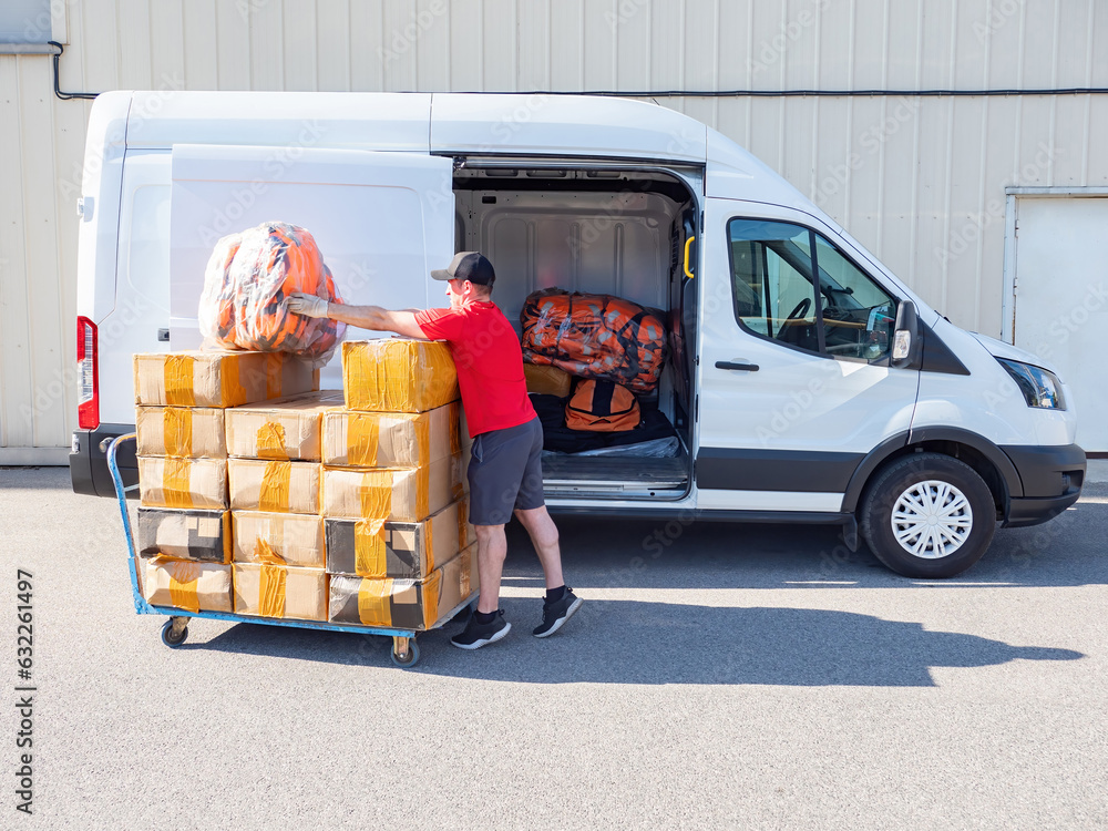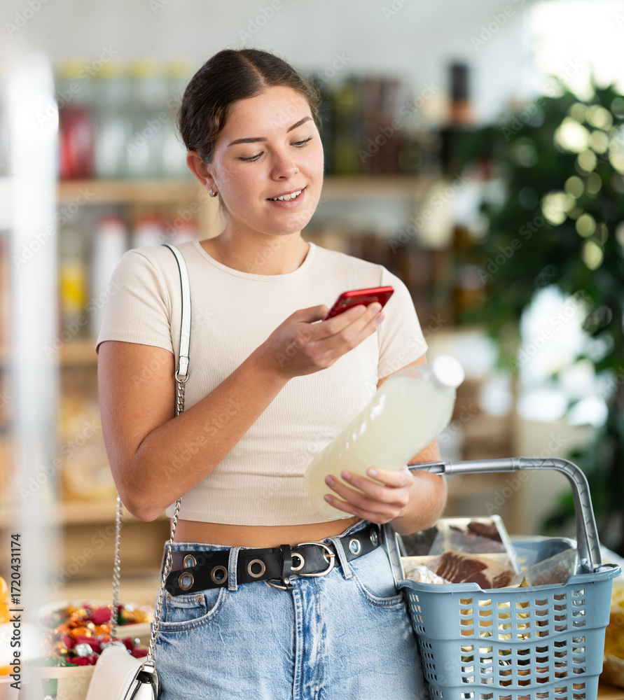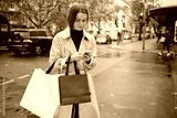 Attractive stylish girl with shopping bags happily using smartphone while standing on cozy city street