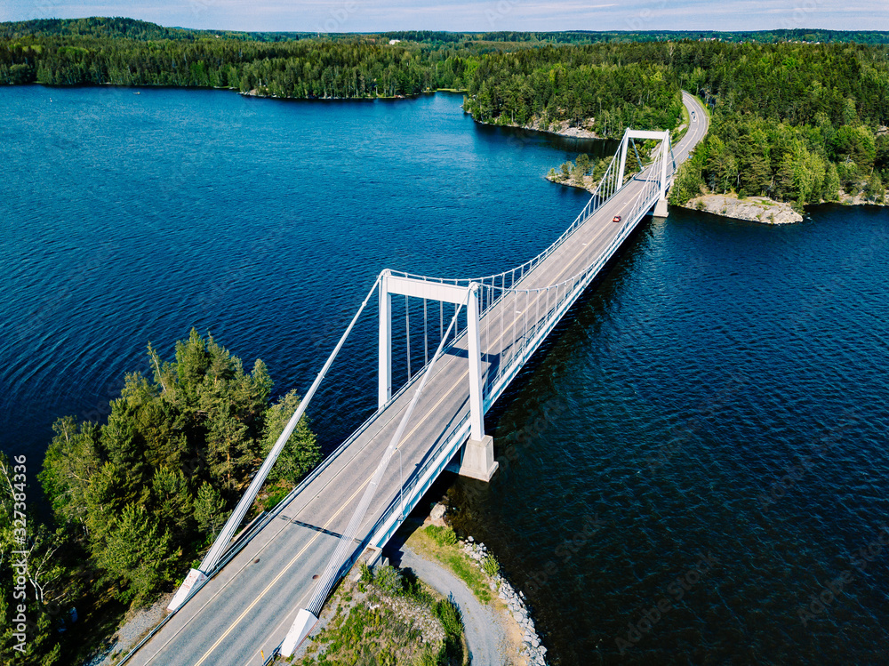 Aerial view of white suspension bridge with car crossing over blue lake in Finland