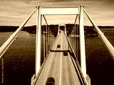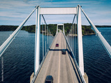 Aerial view of white suspension bridge with car crossing over blue lake in Finland