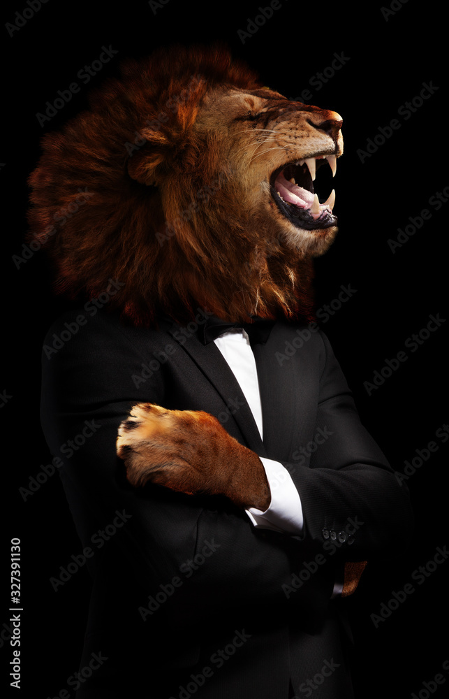 Boss concept lion in the office formal suite an shirt on black - dangerous businessman image mixed media