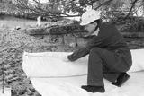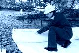 a worker in a workwear hides with a special cloth the bottom of an artificial lake, side view