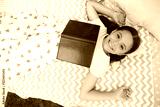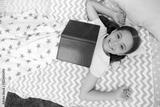 Fantasy literature. Happy girl read fantasy book in bed. Small kid enjoy reading. Fantasy and fantastic fiction. Developing child fantasy and imagination. Imaginary world. Fairy tale. Bedtime reading