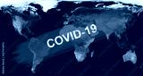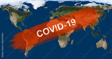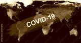 COVID-19 on world map. Coronavirus pandemic and global crisis concept. Elements of this image furnished by NASA.