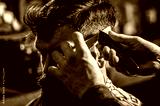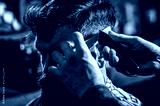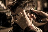 Barber works with hair clipper. Hipster client getting haircut. Hands of barber with hair clipper, close up. Haircut concept. Man visiting hairstylist in barbershop