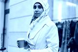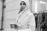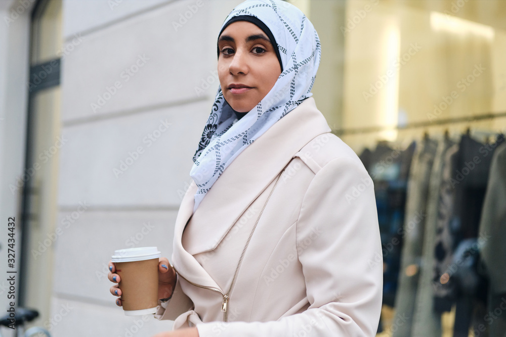 Young casual Arabic woman in hijab walking around street with coffee to go