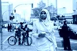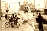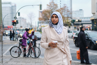 Young beautiful Arabic woman in hijab walking around street with coffee to go