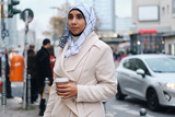 Young attractive Arabic woman in hijab dreamily walking around street with coffee to go