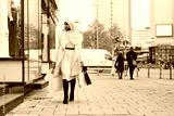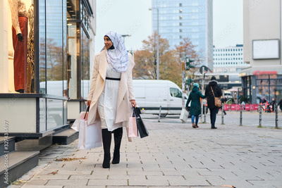 Young stylish Arabic woman in hijab walking around street with shopping bags
